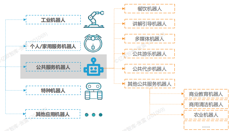 于2021年正式實(shí)施的新國標GB/T 39405-2020從五個(gè)維度對機器人進(jìn)行分類(lèi)。根據應用L域,機器人可分為五大類(lèi),其中公共服務(wù)機器人 是和工業(yè)機器人相對應的一大類(lèi)別;根據服務(wù)對象的不同,公共服務(wù)機器人還可以分為餐飲、講解引導、多媒體、其他公共服務(wù)機器人等