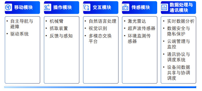 模塊化設計通過(guò)將機器人系統分解為多個(gè)軟硬 件模塊 ,廠(chǎng)商和用戶(hù)可以根據不同的應用需求 進(jìn)行靈活組合和定制。這一設計理念不僅提升 了產(chǎn)品的適應性和可擴展性 ,還為技術(shù)的創(chuàng )新 與產(chǎn)品的迭代提供了可能性 ,是開(kāi)放性的全棧 式智能服務(wù)機器人生態(tài)系統的基石。服務(wù)機器 人模塊化設計以多個(gè)軟硬件模塊——移動(dòng)模 塊、操作模塊、交互模塊、傳感模塊和數據處 理與通信模塊為核心。通過(guò)這種靈活的設計, 服務(wù)機器人能夠大大提升在不同場(chǎng)景中能夠靈活應對復雜任務(wù)的能力。