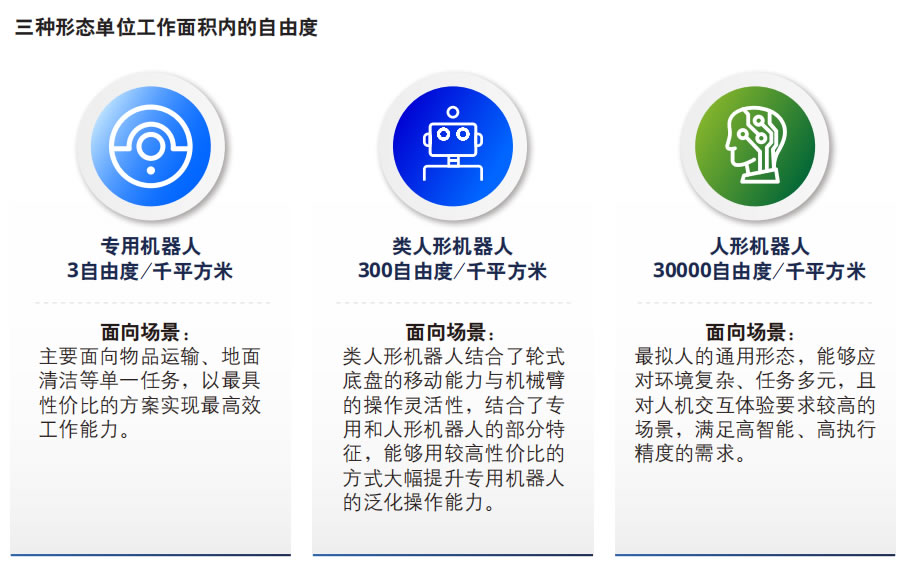 基于 “單位工作面積自由度”這一指標,可以更好地理解專(zhuān)用、類(lèi)人形、人形三種形態(tài)機器人各自 的優(yōu)勢和適用場(chǎng)景,以及如何根據特定的應用需求選擇合適的機器人形態(tài),從而進(jìn)一步推動(dòng)生態(tài)的 構建: