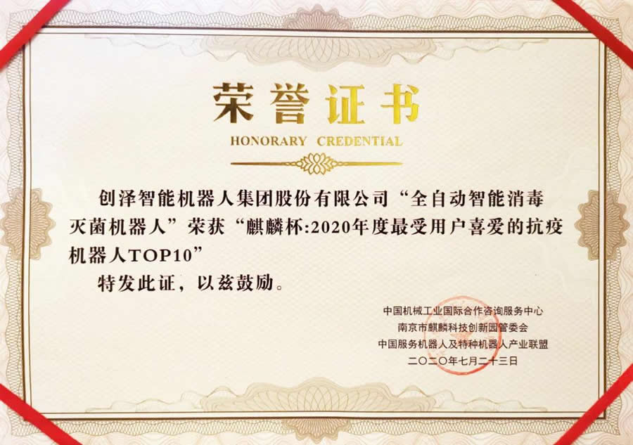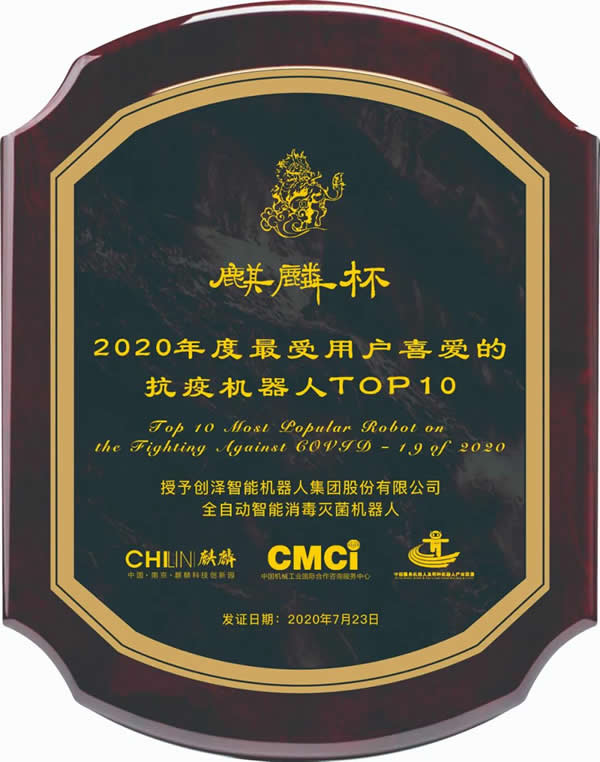 2020年7月23日,由機械工業(yè)國際合作咨詢(xún)服務(wù)中心、南京麒麟科創(chuàng )園管委會(huì )、服務(wù)機器人及特種機器人產(chǎn)業(yè)聯(lián)盟聯(lián)合主辦的2020第六屆國際服務(wù)機器人產(chǎn)業(yè)G峰論壇暨“第三屆麒麟杯頒獎典禮在南京舉行。此次典禮上,智能服務(wù)機器人L軍企業(yè)創(chuàng )澤集團被授予“麒麟杯:2020年度受用戶(hù)喜愛(ài)的抗疫機器人TOP10”榮譽(yù)證書(shū)。