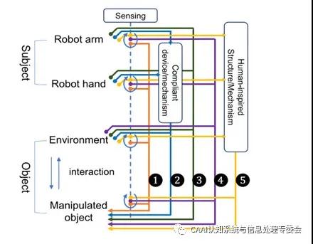 文章介紹了G精度機器人操控的五類(lèi)方法:(1)基于傳感信息的方法(2)基于柔順機構的方法(3)基于環(huán)境約束的方法(4)基于感知約束集成的方法(5)仿生的方法。如圖1所示,示意圖展示了五類(lèi)方法之間的差異。在機器人操控中,主體是機器人的手臂和手,客體是環(huán)境和被操控的對象。虛線(xiàn)表示傳感信息,回路表示傳感器感知到的狀態(tài)。