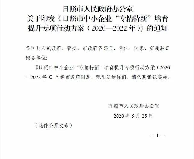 5月25日,日照市人民政府辦公室印發(fā)了《日照市中小企業(yè)“專(zhuān)精特新”培育提升專(zhuān)項行動(dòng)方案(2020—2022年)》的通知