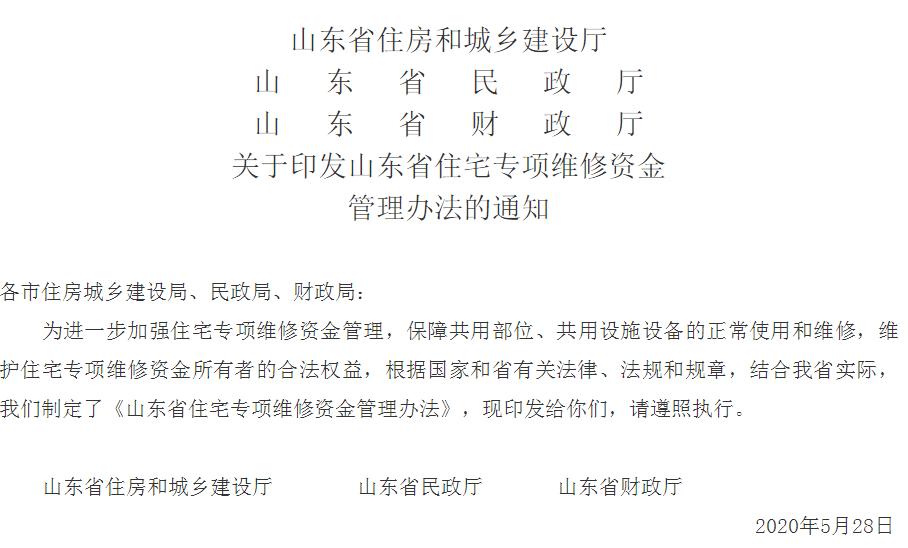 D一條 為了加強對住宅專(zhuān)項維修資金(以下簡(jiǎn)稱(chēng)維修資金)的管理,保障住宅共用部位、共用設施設備的正常使用和維修,維護維修資金所有者的合法權益,根據《中華人民共和國物權法》《物業(yè)管理條例》《山東省物業(yè)管理條例》《住宅專(zhuān)項維修資金管理辦法》等法律、法規和規章的規定,結合本省實(shí)際,制定本辦法。