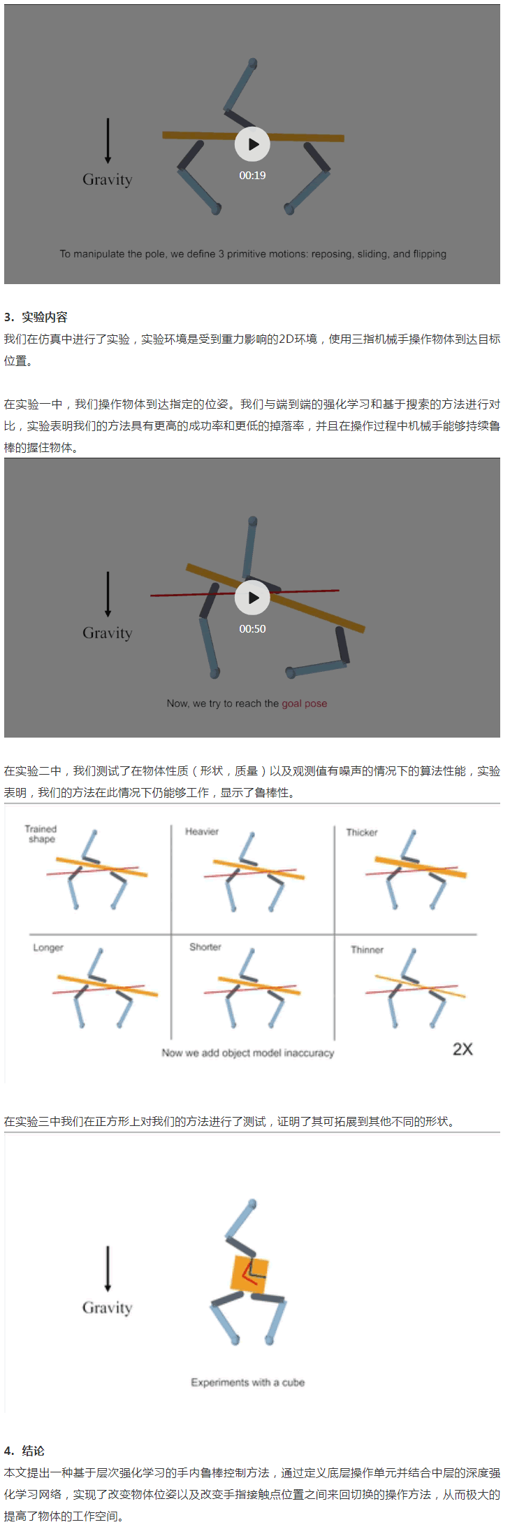 傳統上,手內操作有兩類(lèi)解決方案,一類(lèi)是基于模型的方法(model-based method),通過(guò)對抓取的動(dòng)力學(xué)建模,來(lái)控制手指移動(dòng)帶動(dòng)物體姿態(tài)。這種辦法好處在于穩定性強,模型簡(jiǎn)單,但問(wèn)題在于難以實(shí)現較長(cháng)和復雜的手內操作流程,特別是目標位姿和起始位姿相距很遠的情況,因為它們很難規劃手指接觸點(diǎn)的移動(dòng);另一類(lèi)方法是無(wú)模型方法(model-free method),通常使用深度強化學(xué)習的方法。這類(lèi)方法優(yōu)點(diǎn)在于不需要系統模型,但缺點(diǎn)在于穩定性差,并且需要大量數據進(jìn)行訓練。而我們的方法結合了這兩種方法:在底層使用傳統的動(dòng)力學(xué)建模方式保持穩定的抓取和實(shí)現簡(jiǎn)單基本的操作單元,在中層通過(guò)深度強化學(xué)習來(lái)進(jìn)行規劃,選擇不同的操作單元,終實(shí)現穩定且復雜的操作流程。我們的方法結合了兩種方法的優(yōu)點(diǎn):在底層通過(guò)使用基于模型的操作單元,保證了手指與物體之間持續穩定的抓;在中層使用強化學(xué)習進(jìn)行規劃,從而實(shí)現較長(cháng)和復雜的手內操作流程。