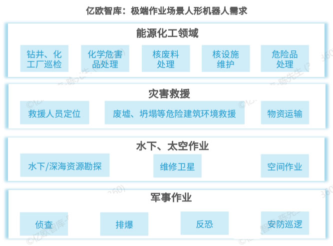 J端作業(yè)場(chǎng)景對人形機器人有廣泛的需求,人形機器人可在惡劣環(huán)境下幫助或替代救援人員操作,解決人員短缺及生命安全問(wèn)題,從而提G救援效 率、減少人員傷亡、提G物資運輸效率等。