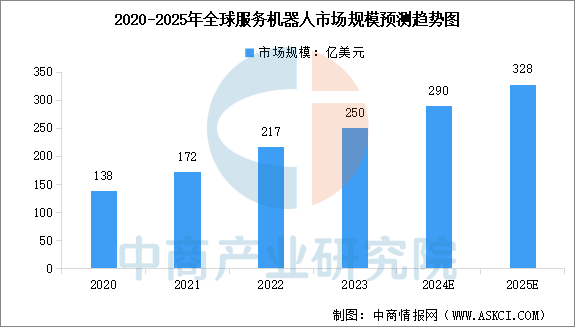隨著(zhù)人口老齡化的加劇,老年人對醫療、康復、陪伴等服務(wù)的需求日益增加,為服務(wù)機器人提供了廣闊的市場(chǎng)空間。2023年服務(wù)機器人市場(chǎng)規模達到約250億美元,比上年增長(cháng)15.21%。中商產(chǎn)業(yè)研究院分析師預測,2024年服務(wù)機器人市場(chǎng)規模將達到290億美元,2025年達到328億美元。