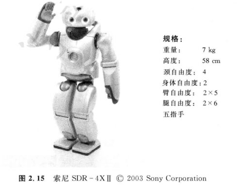 索尼夢(mèng)想機器人,即SDR-4X Ⅱ模型,如圖2.15所示。這個(gè)流行的模型是1997 年開(kāi)始的研究結果,它以運動(dòng)表演和交際娛樂(lè )(如跳舞和唱歌)為基本目的。這個(gè)具 有38個(gè)自由度的機器人,為了聲音的精細定向、基于圖像的人員識別、單板微型立體 景深圖的重構以及有限的語(yǔ)音識別,裝有7個(gè)麥克風(fēng)。給定了流媒體和娛樂(lè )運動(dòng)的 目標,索尼公司花費了巨大的精力設計了運動(dòng)的原型應用系統,它能使他們的工程師 以簡(jiǎn)捷的方式編排舞蹈。要注意的是,SDR-4XI 比較小,站立58cm, 重量?jì)H6.5kg。