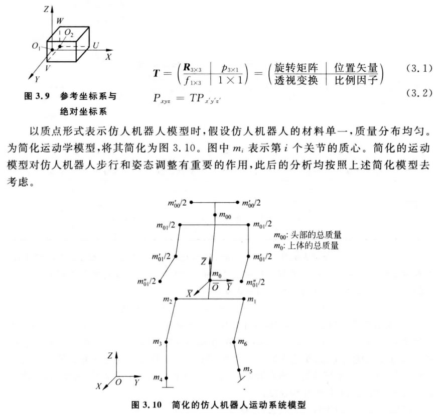 為了便于步態(tài)分析和設計,建模時(shí)將軀干近似 為一個(gè)桿,不考慮肘關(guān)節運動(dòng),兩個(gè)手臂各視為一個(gè)桿,只考慮兩 臂運動(dòng)產(chǎn)生的水平面上旋轉力矩,在此基礎上建立智能接待仿人機器人的 簡(jiǎn)化運動(dòng)模型[95]。先,在智能接待仿人機器人的腰部固連一個(gè)參考坐標 系O₂, 再在智能接待仿人機器人步行起點(diǎn)的重心投影處建立一個(gè)相對于地 面靜止的絕對坐標系O₁, 圖3.9為參考坐標系與絕對坐標系的關(guān)系示意圖。兩個(gè)坐標系的轉換可以用下式描述: