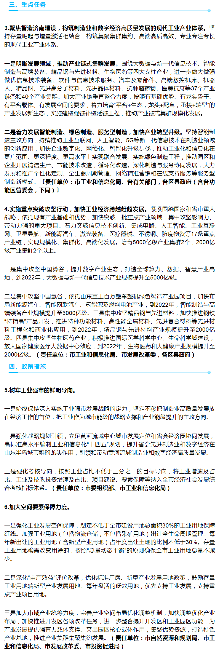 1.總體要求。堅持以新時(shí)代中國特色社會(huì )主義思想為指導,認真貫徹落實(shí)總書(shū)記對山東、對濟南工作的重要指示要求,對標對表“走在前列、多面開(kāi)創(chuàng )”目標定位,按照省委省政府打造“智造濟南”工作要求,堅持新發(fā)展理念,把推動(dòng)制造業(yè)G質(zhì)量發(fā)展放在經(jīng)濟工作首位,大力實(shí)施工業(yè)強市發(fā)展戰略,以智能制造為主攻方向,深化新一代信息技術(shù)與制造業(yè)融合發(fā)展,加快工業(yè)互聯(lián)網(wǎng)創(chuàng )新發(fā)展,加快制造業(yè)生產(chǎn)方式和企業(yè)形態(tài)根本性變革,加快構建現代產(chǎn)業(yè)體系。聚力打好產(chǎn)業(yè)基礎G級化、產(chǎn)業(yè)鏈現代化攻堅戰,聚焦制造業(yè)優(yōu)化升級、數字經(jīng)濟引L、服務(wù)實(shí)體經(jīng)濟三大重點(diǎn)任務(wù),著(zhù)力培育創(chuàng )新驅動(dòng)、項目帶動(dòng)、政策促動(dòng)三大動(dòng)能,凝心聚力、持之以恒打造先進(jìn)制造業(yè)和數字經(jīng)濟G質(zhì)量發(fā)展雙引擎,鞏固提升工業(yè)經(jīng)濟的支柱地位和輻射帶動(dòng)作用,持續推動(dòng)產(chǎn)業(yè)和城市能級雙提升,為建設“大強美富通”現代化國際大都市提供強大產(chǎn)業(yè)支撐。