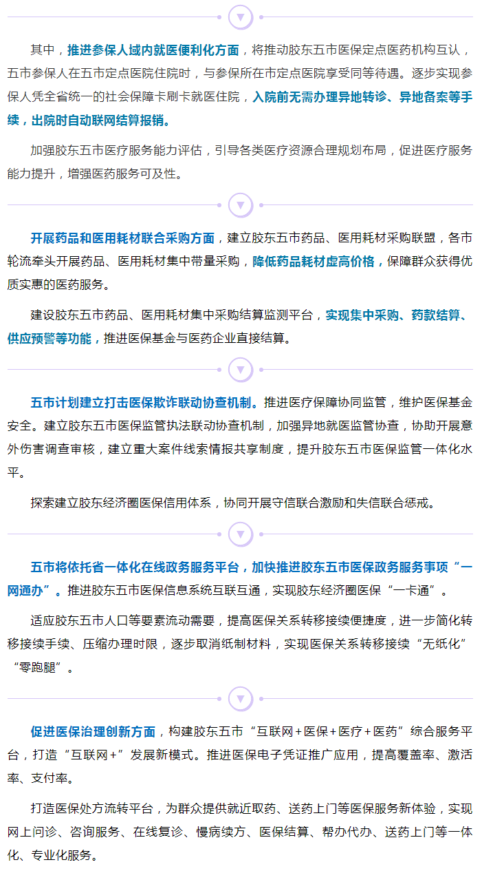 《行動(dòng)方案》是在山東省醫保局指導下,由青島、煙臺、威海、濰坊、日照五市醫保局會(huì )商共同制定!缎袆(dòng)方案》明確,通過(guò)構建“就醫服務(wù)便捷、藥械采購協(xié)同、醫藥產(chǎn)業(yè)集聚、打擊騙保聯(lián)動(dòng)、信息互通共享”的膠東五市醫保發(fā)展共同體,促進(jìn)五市醫保政策更加均衡,醫保服務(wù)更加便捷,醫藥價(jià)格更加優(yōu)惠,全力支持和服務(wù)膠東經(jīng)濟圈一體化發(fā)展大局。