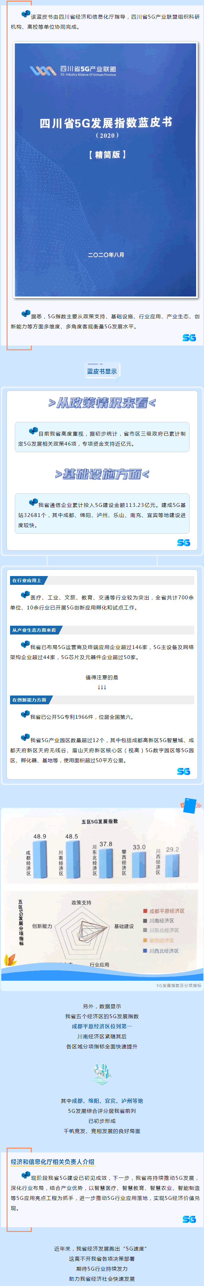 四川省5G產(chǎn)業(yè)聯(lián)盟牽頭編制的《四川省5G發(fā)展指數藍皮書(shū)(2020版)》(下簡(jiǎn)稱(chēng):5G發(fā)展指數)首次發(fā)布。此次發(fā)布的藍皮書(shū)由省經(jīng)濟和信息化廳指導,四川省5G產(chǎn)業(yè)聯(lián)盟組織科研機構、G校等單位協(xié)同完成。該藍皮書(shū)顯示,四川5G建設已初見(jiàn)成效:通信企業(yè)累計投入5G建設金額113.23億元;在創(chuàng  )新能力方面,已公開(kāi)5G專(zhuān)利1966件,位居全國第六,5G產(chǎn)業(yè)園區數量超過(guò)12個(gè);在產(chǎn)業(yè)生態(tài)方面,已布局5G運營(yíng)商及終端應用企業(yè)超146家,5G主設備及網(wǎng)絡(luò )架構企業(yè)超44家,5G芯片及元器件企業(yè)超50家。