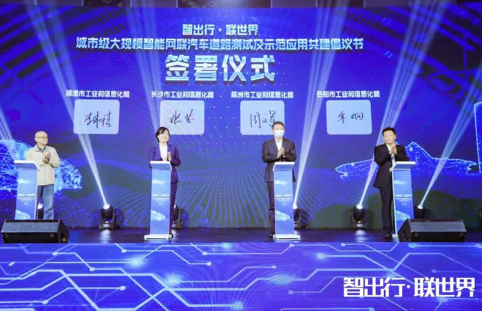 長(cháng)沙市、株洲市、湘潭市、岳陽(yáng)市工業(yè)和信息化局共同簽署了《城市級大規模智能網(wǎng)聯(lián)汽車(chē)道路測試及示范應用共建倡議書(shū)》。
