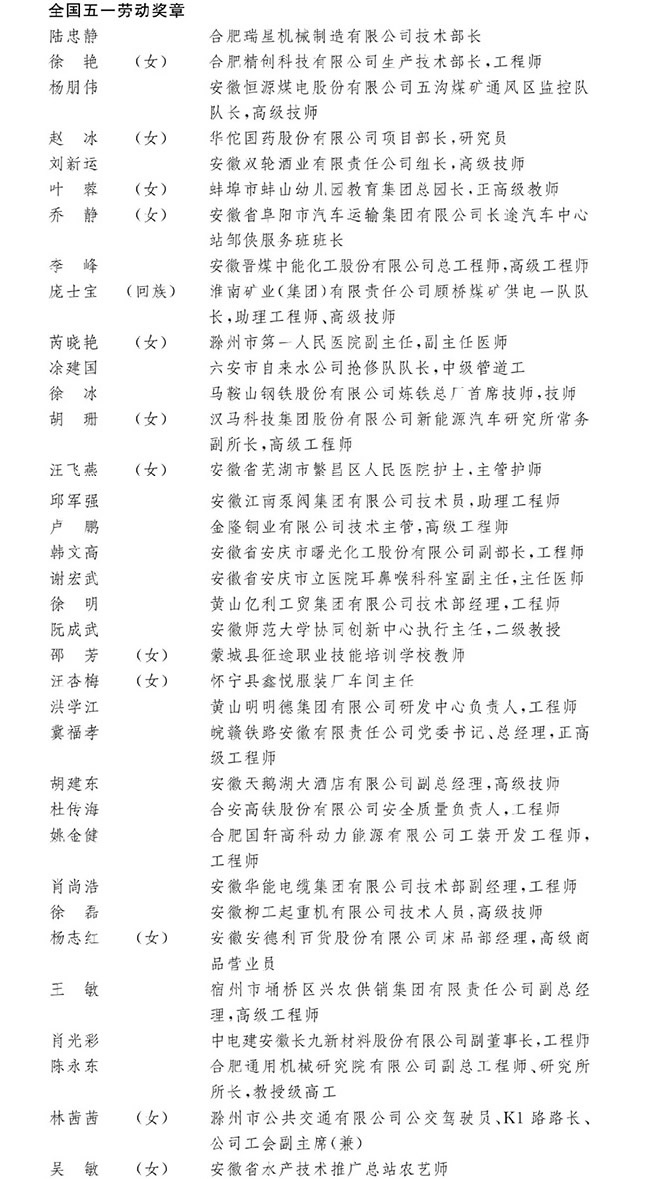 2021年安徽省全國五一勞動(dòng)獎?wù)芦@得者名單