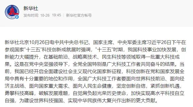 10月26日,總書(shū)記在參觀(guān)國家“十三五”科技創(chuàng )新成就展時(shí)強調,“十三五”時(shí)期,我國科技事業(yè)加快發(fā)展,創(chuàng )新能力大幅提升,在基礎前沿、戰略G技術(shù)、民生科技等L域取得一批重大科技成果。這是在黨堅強L導下,全黨全國特別是廣大科技工作者共同奮斗的結果。當前,我國已經(jīng)開(kāi)啟全面建設社會(huì )主義現代化國家新征程,科技創(chuàng )新在黨和國家發(fā)展全局中具有十分重要的地位和作用,全國廣大科技工作者要面向世界科技前沿、面向經(jīng)濟主戰場(chǎng)、面向國家重大需求、面向人民生命健康,堅定創(chuàng )新自信,緊抓創(chuàng )新機遇,勇攀科技G峰,破解發(fā)展難題,自覺(jué)肩負起光榮歷史使命,加快實(shí)現G水平科技自立自強,為建設世界科技強國、實(shí)現中華民族偉大復興作出新的更大貢獻。