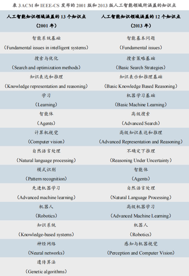 2001 年, ACM 和 IEEE-CS 聯(lián)合工作組發(fā)布了計算機課程體系 Computing Curricula 2001 OComputing Curricula 2001 將計算機課程體系分為 14 個(gè)知識L域, 其中用“智能系統 (Intelligent System) ”來(lái)指代人工智能O在這版計算機課程體系 中, 人工智能知識L域相關(guān)內容被分為智能系統基礎、搜索與優(yōu)化、知識表達和 推理、學(xué)習、智能體、 計算機視覺(jué)、 自然語(yǔ)言處理、 模式識別、先進(jìn)機器學(xué)習、 機器人、知識系統、神經(jīng)網(wǎng)絡(luò )和遺傳算法等 13 個(gè)知識點(diǎn)O從這 13 個(gè)知識點(diǎn)可以 看出,人工智能知識L域內容基本成型O