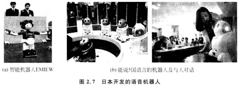 日本日立公司也研制了一臺智能機器人EMIEW, 它的個(gè)頭和小孩一樣,依靠輪子移 動(dòng),如圖2.7(a)所示。由于身上裝有數碼相機和雷達探測器,它可以自動(dòng)地躲避障礙物。 同時(shí)它的詞匯儲備量達到100多個(gè),能夠對一些簡(jiǎn)單的聲音指令做出反應,并且還能夠 和人進(jìn)行簡(jiǎn)單的對話(huà)交流,甚至播報天氣預報等。第二代 EMIEW2 機器人可以通過(guò)無(wú) 線(xiàn)電裝置接收指令,然后毫不費力地在辦公室之間來(lái)回奔波,為辦公室人員跑腿。它站 立時(shí)身高大約為31.5英寸,體重為29磅。它能夠對障礙物應付自如,對人的語(yǔ)音做出 回應,并且一次充電后即可工作1小時(shí)。此外,能說(shuō)5國語(yǔ)言的機器人及與人對話(huà)的機 器人也已經(jīng)誕生了,如圖2.7(b) 所示。在我國舉辦的日語(yǔ)演講大賽現場(chǎng)上,參加比賽的 選手以及日語(yǔ)院校的學(xué)生不但與該機器人進(jìn)行了交流互動(dòng),而且該機器人還獻上了許多 精彩舞蹈和歌曲。