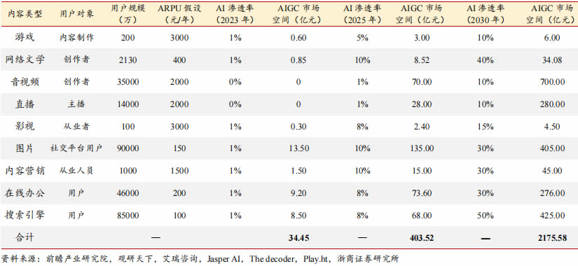 式,測算國內 2023 年、2025 年和 2030 年 AIGC 市場(chǎng)空間。