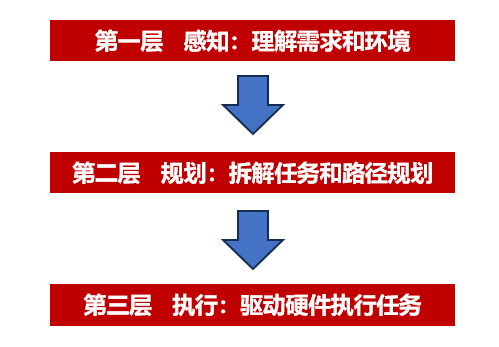 AI 機器人在完成任務(wù)時(shí)需要經(jīng)歷三個(gè)層次。給到機器人一個(gè)任務(wù)時(shí),機器人一般要經(jīng)歷