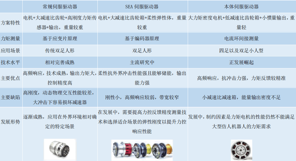 伺服驅動(dòng)器工作原理:要實(shí)現機器人的準確運動(dòng),每個(gè)關(guān)節需要能產(chǎn) 生準確的輸出位置和力矩。每個(gè)舵機在接收到位置指令后,可以實(shí)時(shí)響應命令,多個(gè)舵機協(xié)調運行, 就可以產(chǎn)生猶如人類(lèi)一般靈活的運動(dòng)。大型伺服驅動(dòng)器有三種類(lèi)型,分別為常規伺服驅動(dòng)器、SEA 伺服驅動(dòng)器、本體伺服驅動(dòng)器。常規伺服驅動(dòng)器主要由力矩電機、諧波減速器、電機編碼器、輸出 編碼器、驅動(dòng)板、制動(dòng)器組成。